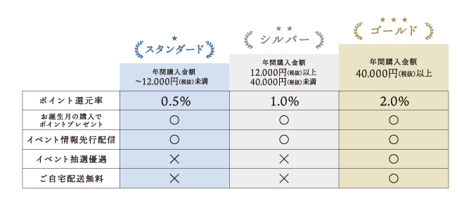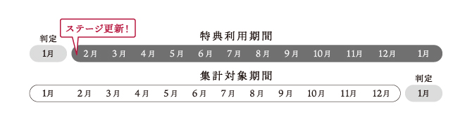 前年1月~12月の年間購入金額に応じて毎年2月にステージが判定されます。ステージごとのポイント還元率と特典は下図をご覧ください。会員ステージはクラブ三省堂アプリMyページ・三省堂書店公式LINEアカウントでご確認いただけます。