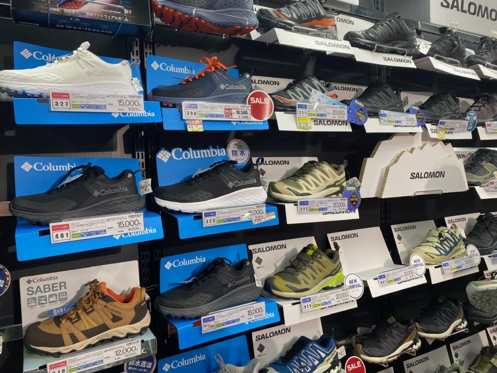 現在、サロモンのシューズがとても人気です。低山などの軽登山では、ローカットタイプを選ばれる方が多くなっています。一方で、本格的な登山をされる方には、サポート力のあるハイカットタイプが選ばれています。日常使いも含めて考えると、最近はローカットタイプがトレンドになっています。サロモンは、今とくにおすすめしているブランドの一つです。登山用シューズは基本的に防水性が重視されます。機能面でも安心してお選びいただける点が、多くのお客様に支持されている理由です。