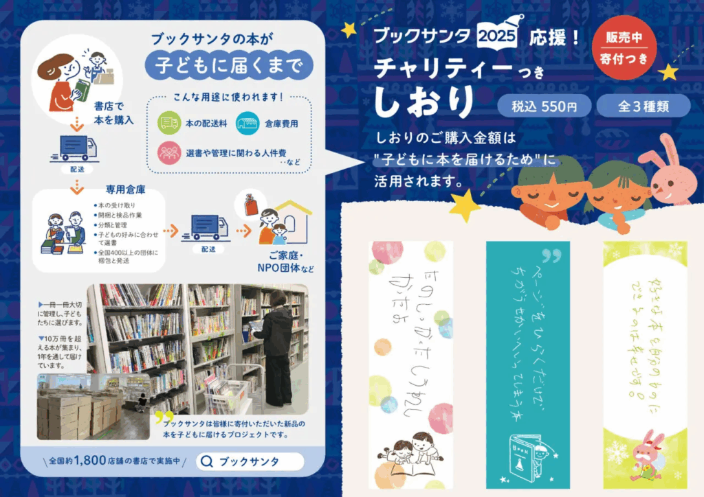 また今年はブックサンタ事務局作成の寄付付きしおりも販売中です。ご購入代金は本の配送料や倉庫費用など、子どもに本を届ける活動に使われ、書店とブックサンタの両方の応援につながります。