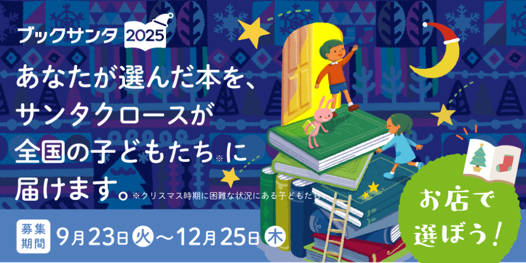ブックサンタは「厳しい状況に置かれている全国の子どもたち※に本を届けること」を目的に2017年スタートした、全国のNPOと書店が連携したプロジェクト。パートナー書店で子どもたちに贈りたい本を購入、レジでその本を寄付すると、全国の子どもたちに「サンタクロースから本が届く」というチャリティプログラムです。