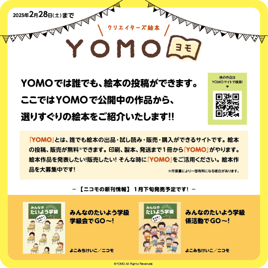 YOMOは誰でも絵本の出品・試し読み・販売・購入が出来る絵本サイトです。絵本の投稿、販売を無料※で行なえます。※作業量により一部有料になる場合があります。