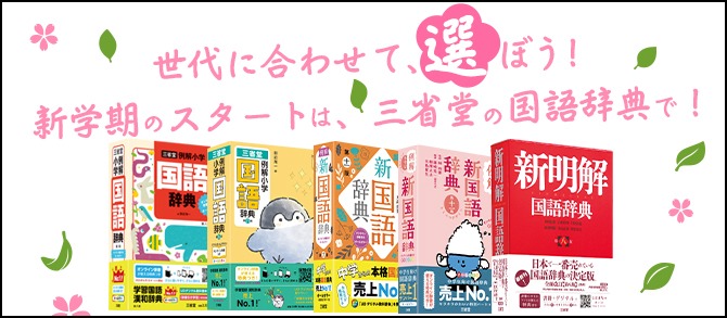三省堂では、その学習段階に応じて、それぞれに向いた国語辞典を刊行しています。小学生向けには、オールカラーで読みやすい「例解小学国語辞典」、中学生に向けては、その世代で圧倒的な支持を得ている「例解新国語辞典」、高校生以上の方には、その鋭い語釈が大好評の「新明解国語辞典」がおススメです。